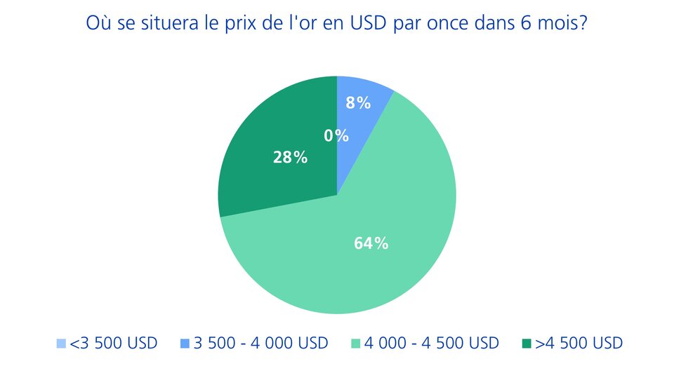 Les résultats de l'enquête montrent que, malgré un doublement du prix de l'or en deux ans, seulement 8% des CIO interrogés s'attendent à une baisse du prix de l'or au cours des six prochains mois (voir graphique 1). Il est également remarquable qu'aucun des experts interrogés n'ait sous-pondéré l'or dans son portefeuille, et aucun sondé ne prévoit une baisse du prix en dessous de USD 3 500 par once. Au contraire, près d'un tiers des CIO anticipent une nouvelle forte hausse au-delà de la marque des USD 4 500.